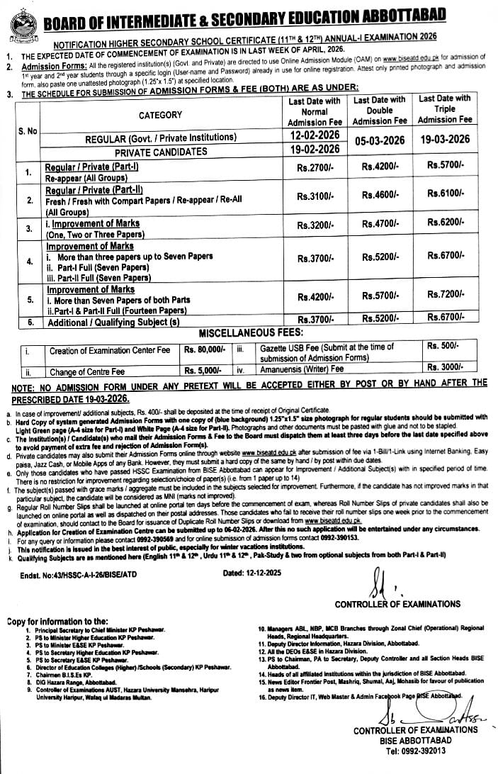 NOTIFICATION HSSC ANNUAL-I EXAMINATION 2026
