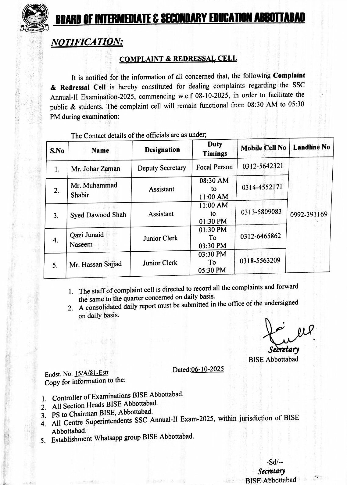 COMPLAINT AND REDRESSAL CELL REGARDING SSC ANNUAL EXAMINATION-II 2025