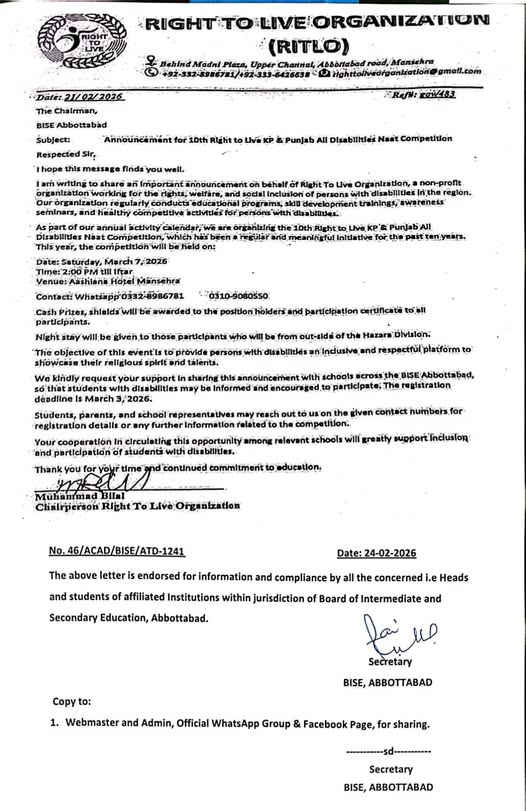 ANNOUNCEMENT FOR 10TH RIGHT TO LIVE KPK & PUNJAB ALL DISABILITIES NAAT COMPETITION
